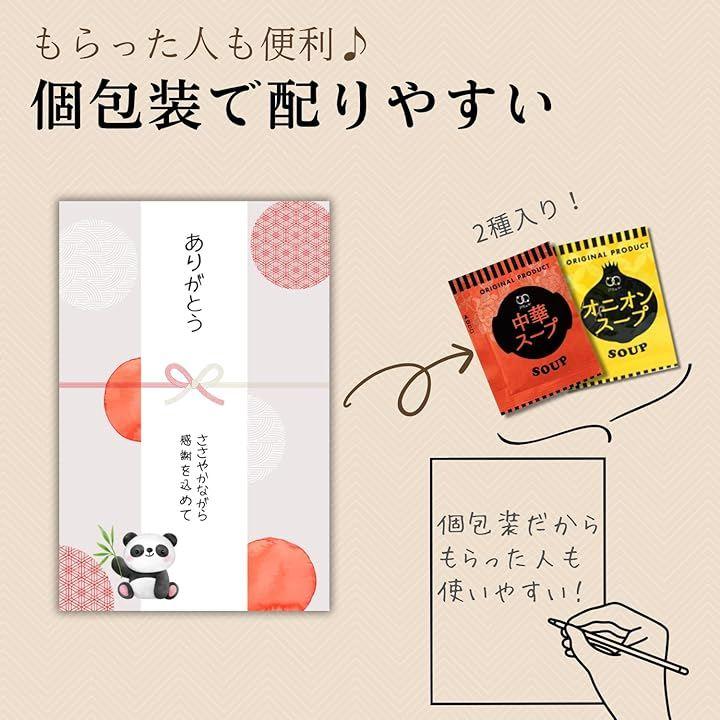 「仕様詳細」 1袋の内容:そのままでも美味しい「オニオンスープ」と「中華スープ」すべて個包装なので、受け取った方も、1袋ずつ召し上がる事ができます。