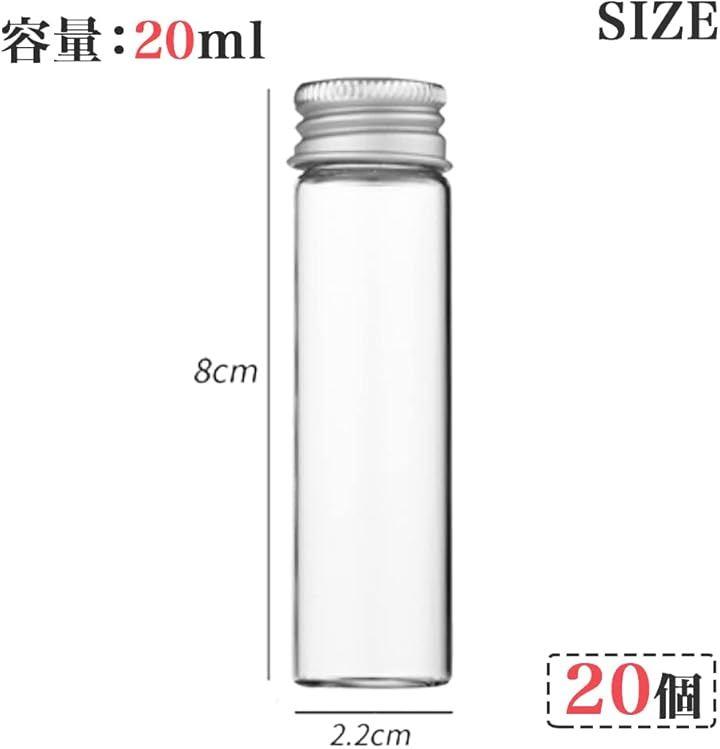 「商品内容」ミニチュアガラスボトル:20個 サイズ:直径22mm、高さ80mm、容量20ml 材質:瓶 / ガラス製、キャップ / アルミニウム カラー:瓶 / クリア(透明)、キャップ:シルバー