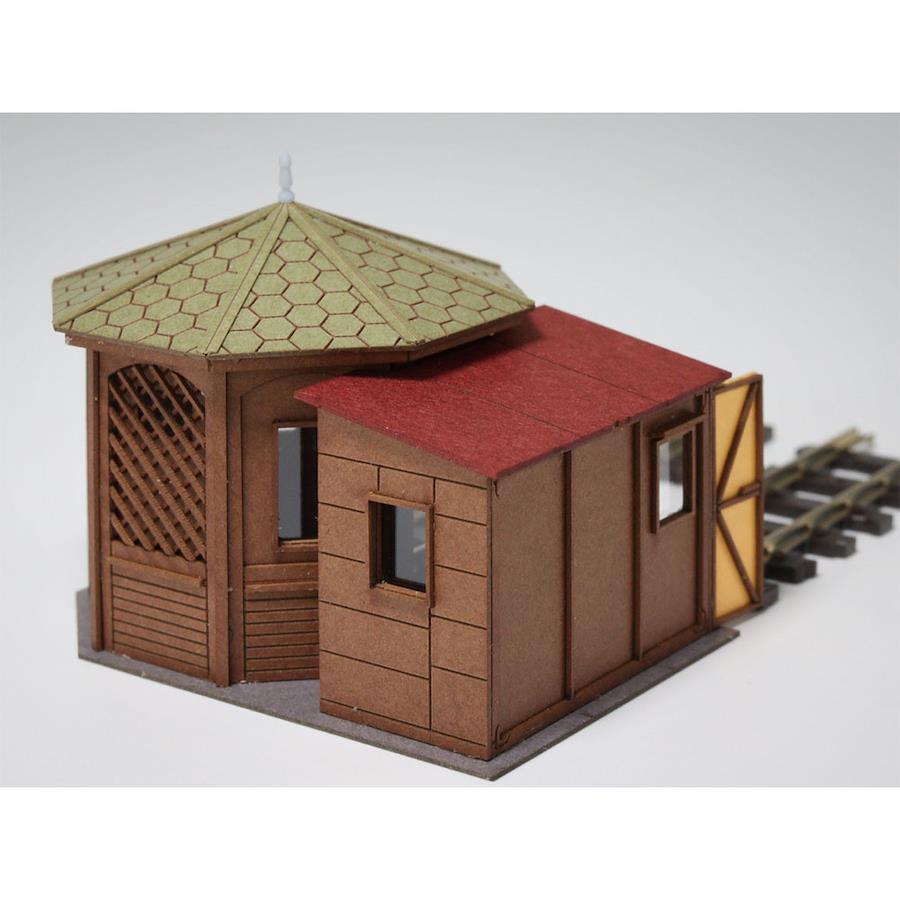 This pre-colored paper kit is designed to look like a "small engine house" just large enough to fit two storage battery train.