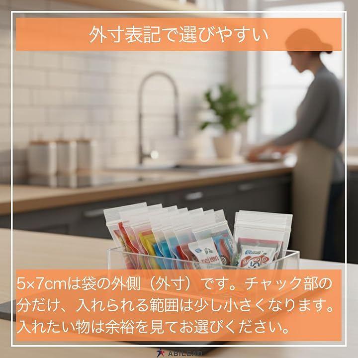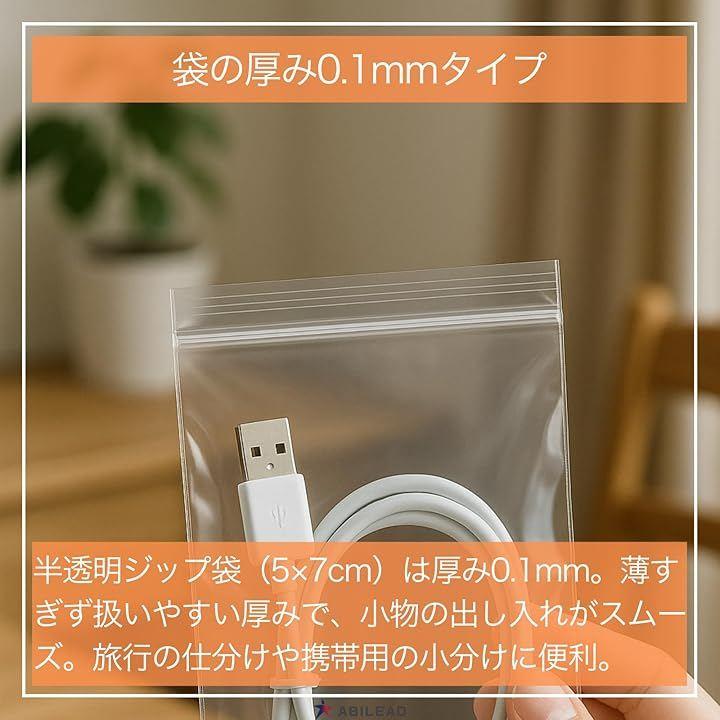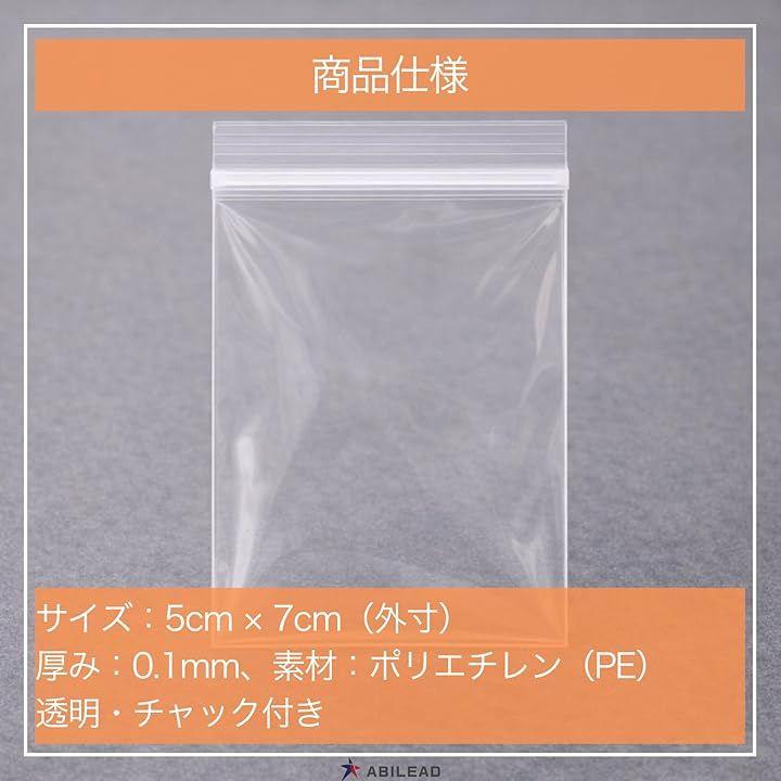 「商品仕様」外寸:5cmx7cm/厚さ:0.1mm (100µm) *一般的な店舗で扱うチャック袋の厚みは約0.06~0.1mmが主流で、本品は上限側に位置します/材質:PE(半透明)/開口部:チャック付き(端まで密着・こぼれにくい設計)/梱包:小袋による簡易梱包。