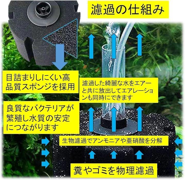 「スポンジ フィルター 濾過の仕組み」糞やゴミを物理濾過>生物濾過でアンモニアや亜硝酸を分解>濾過した綺麗な水をエアーと共に放出してエアレーションも同時にできます