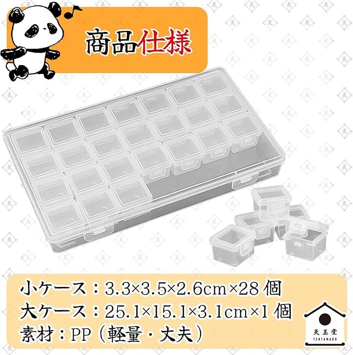 「商品スペック」小ケース:3.3x3.5x2.6cmx28個、大ケース:25.1x15.1x3.1cmx1個、素材:PP