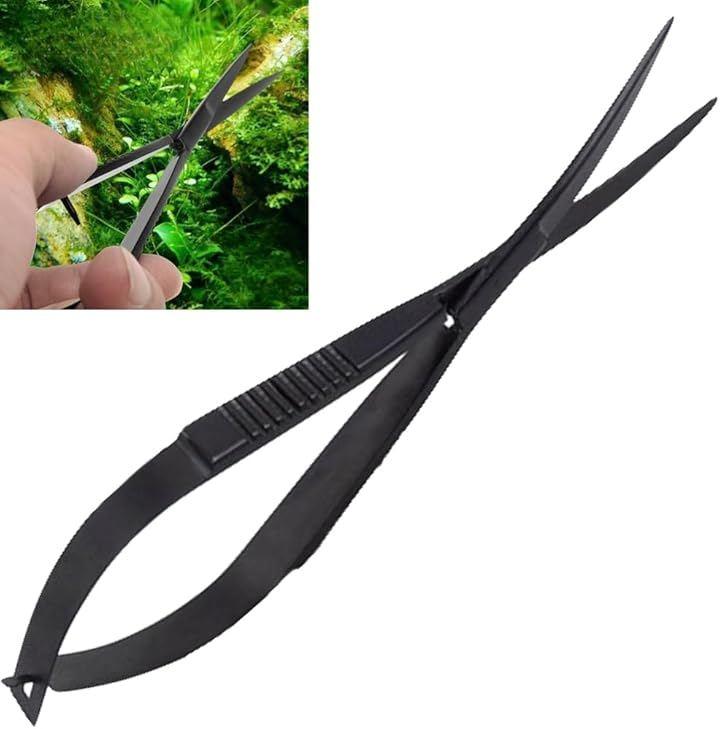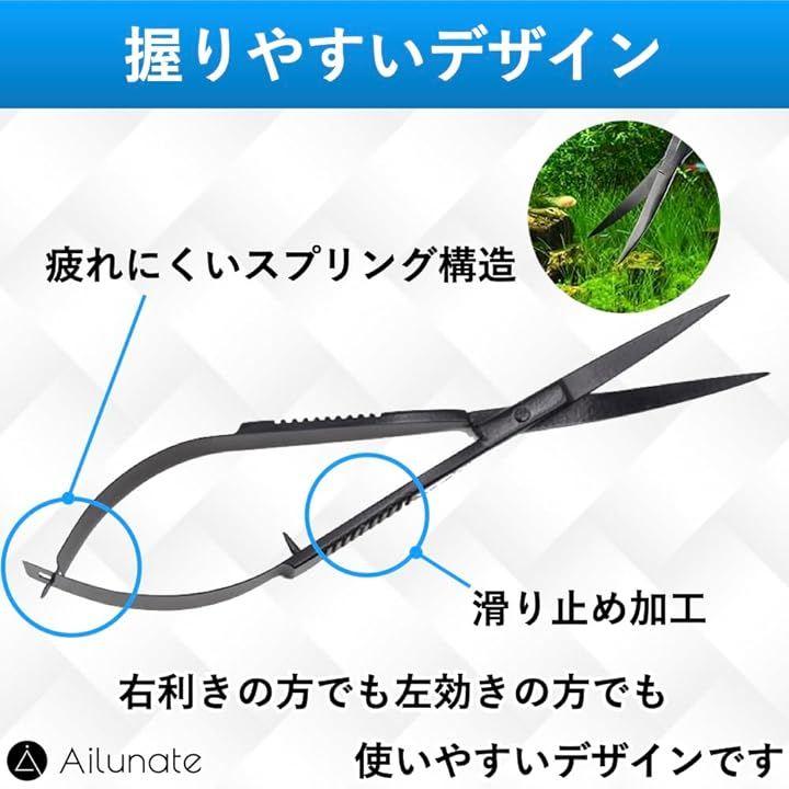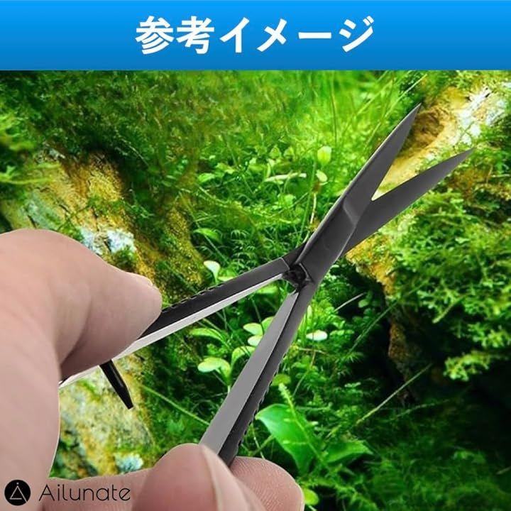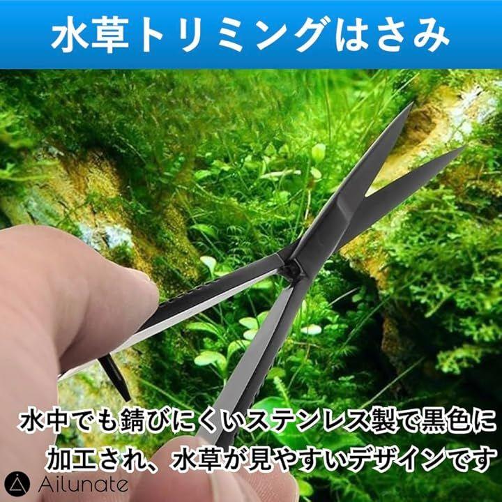 「水草トリミングハサミ」水中でも錆びにくいステンレス製でブラックコーティングされており、水槽内の水草が見やすいデザインになっています。