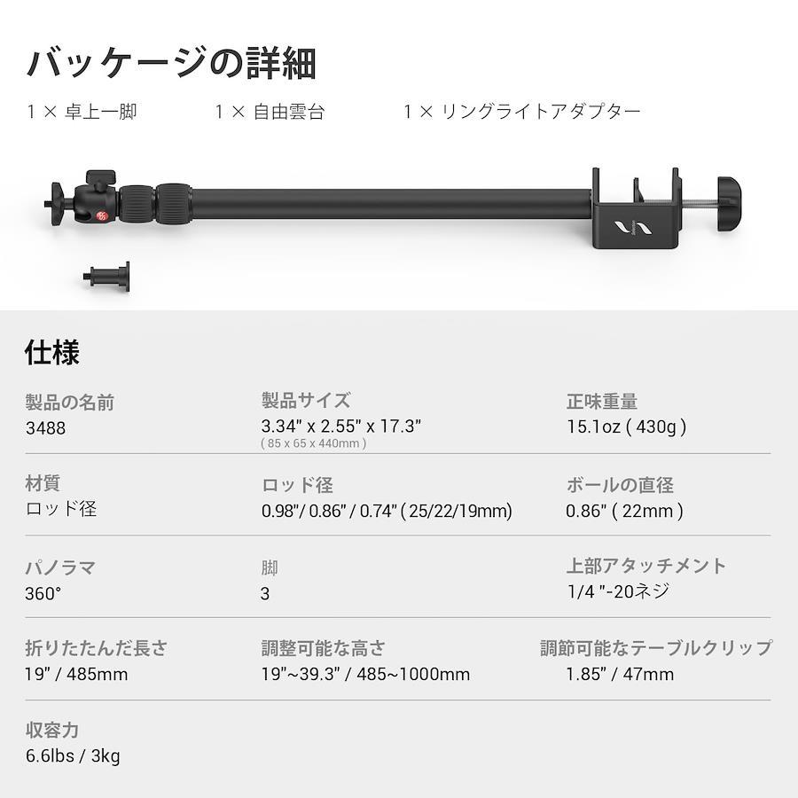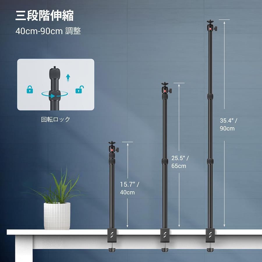 3営業日以内に発送≪新品未開封品≫:【卓上一脚】自由雲台とリングライトアダプターが装備されており、リングライト、デジタル、一眼レフカメラ、スマートフォン、パネルライトなどに最適です。メイクアップ、動画撮影、写真などの撮影作業に使用されます。/【360°回転】上部の自由雲台は、パノラマ撮影のための360°パノラマ回転と、マルチアングル調整のための-90°/ + 45°前傾を保証し、分解せずに機器を簡単に調整できるようにします。最大耐荷重 3kgに達する可能性があります。/【ランプスタンド用】下部のつまみでカメラスタンドを調整します。これは、さまざまなテーブルに適しており、最大6cmの厚さのテーブルに適しており、ランプ三脚よりもスペースを節約できます。/【優れた耐久性】航空用アルミ合金素材、丈夫なチューブ(直径22~25mm)、耐久性と使用安定性に優れ、長期間錆びないようになっています。マットな表面は、指紋を残さずに簡単に掃除できます。重さはわずか430gで、持ち運びが簡単です。/【三段階伸縮】3段階伸縮ポールデザインを採用し、高さは35.4cm-90cmの範囲で調整できるため、撮影や照明などが可能です。ゴムリングの蝶ナットは、ポールをより簡単に固定するのに役立ちます。