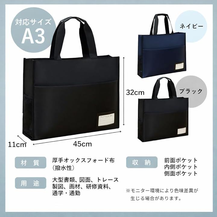 (5) 「仕様」 対応サイズ:A3 本体サイズ:45 x 32 x 11cm 重量:600グラム 材質:厚手オックスフォード布(撥水性) 収納:前面ポケット、内側ポケット、側面ポケット カラー:ブラック/ネイビー 用途:大型書類、図面、トレース、製図、画材、研修資料、通学・通勤