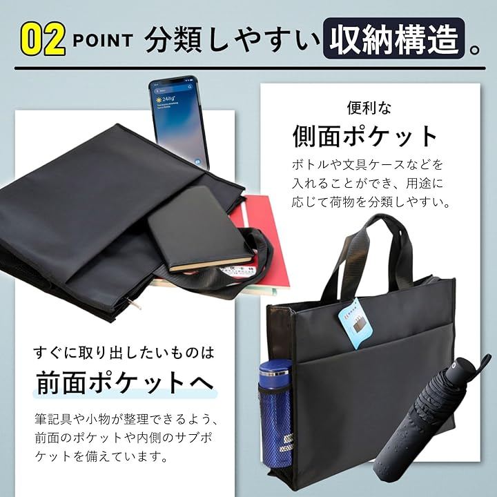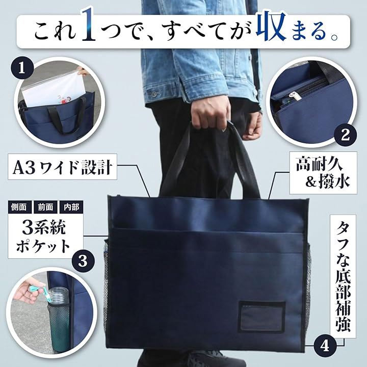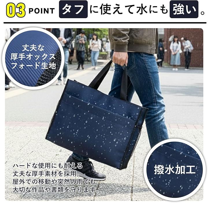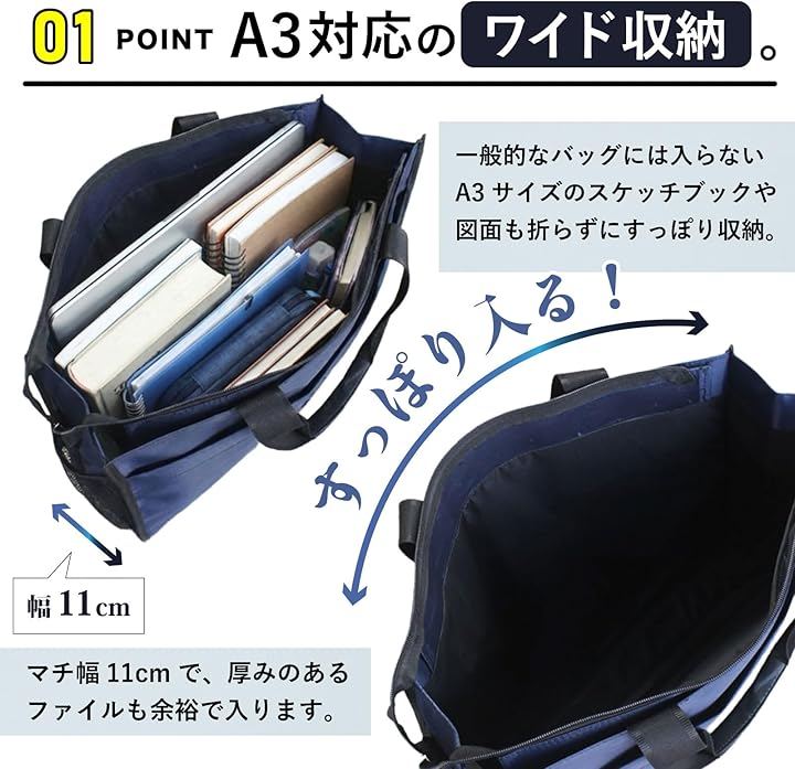 (1) 大型書類や画材をまとめて持ち歩けるA3対応バッグ 本商品は、A3書類やスケッチブック、製図やトレースの作品など、かさばりやすい荷物をひとつにまとめられるトートタイプの書類バッグです。