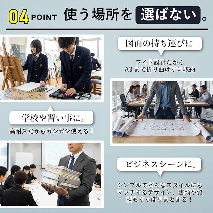 美術系の授業、図案作成、研修資料の持ち運びなど、用途を選びません。