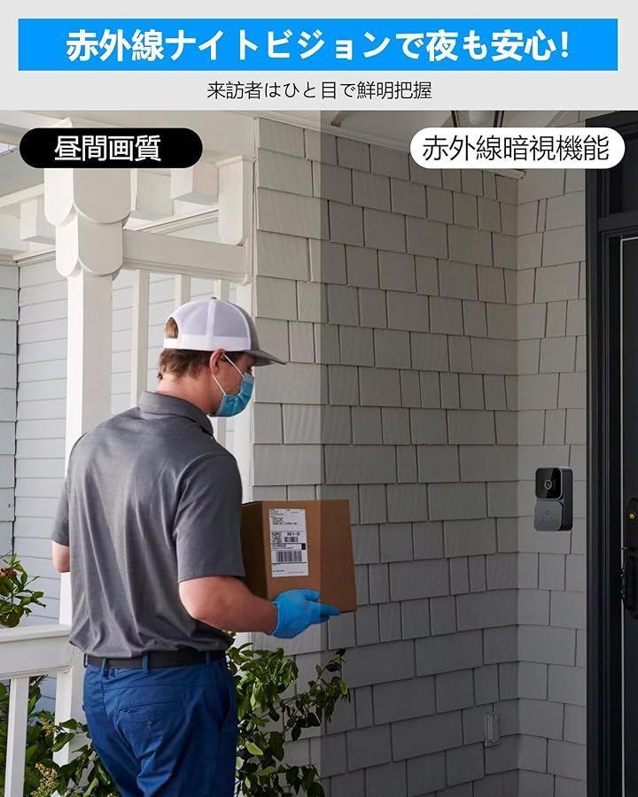 訪問者の顔は鮮明に、そして地面に置かれた荷物、同時に来た複数人、さらに扉横の死角まで一枚の映像で丸ごと記録、るため防犯性も抜群。