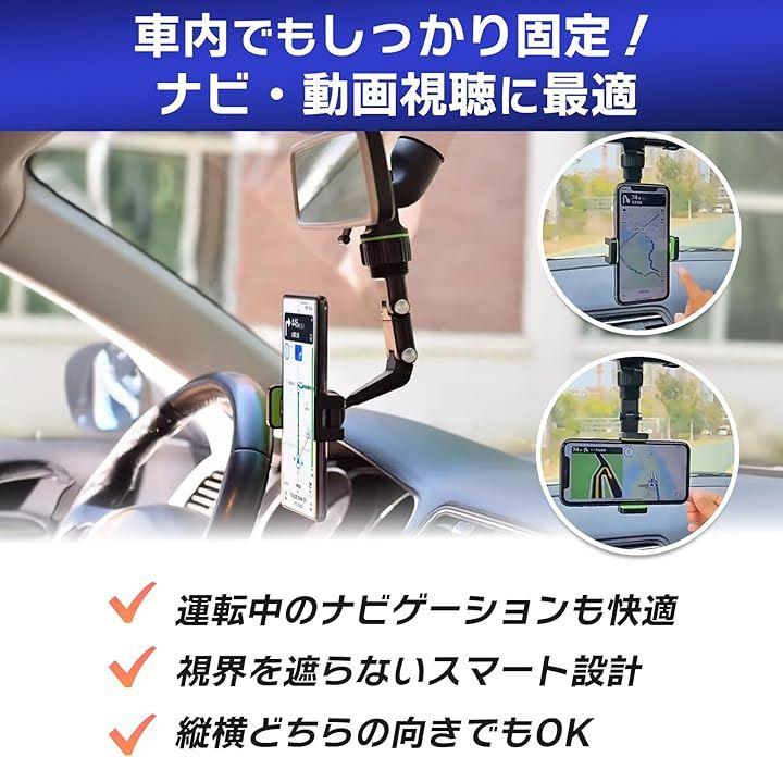 「車載利用に最適なスマホホルダー」ミラー取付による安定感でハンズフリー操作を実現。
