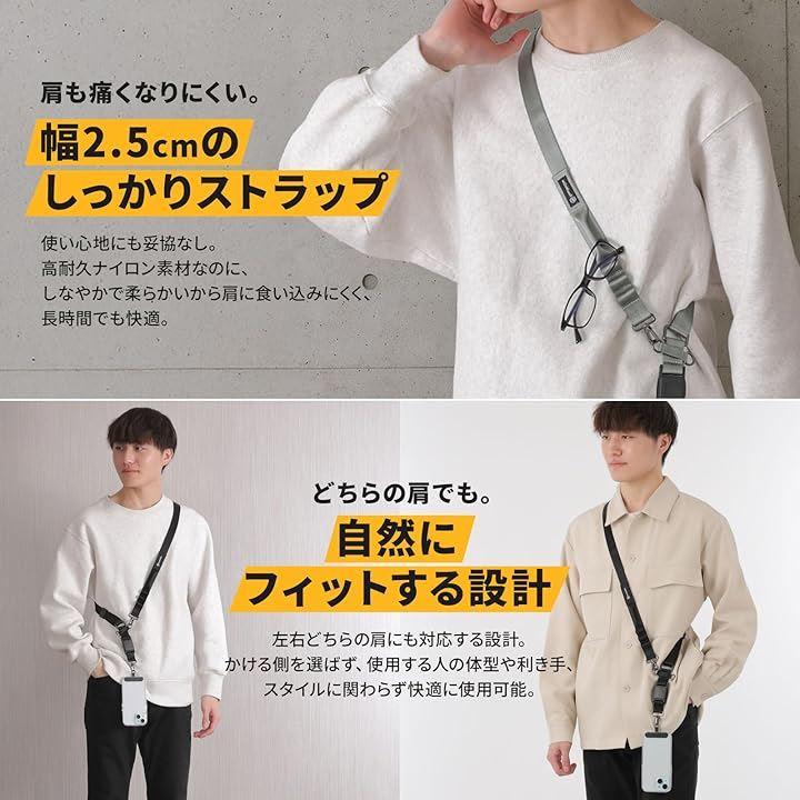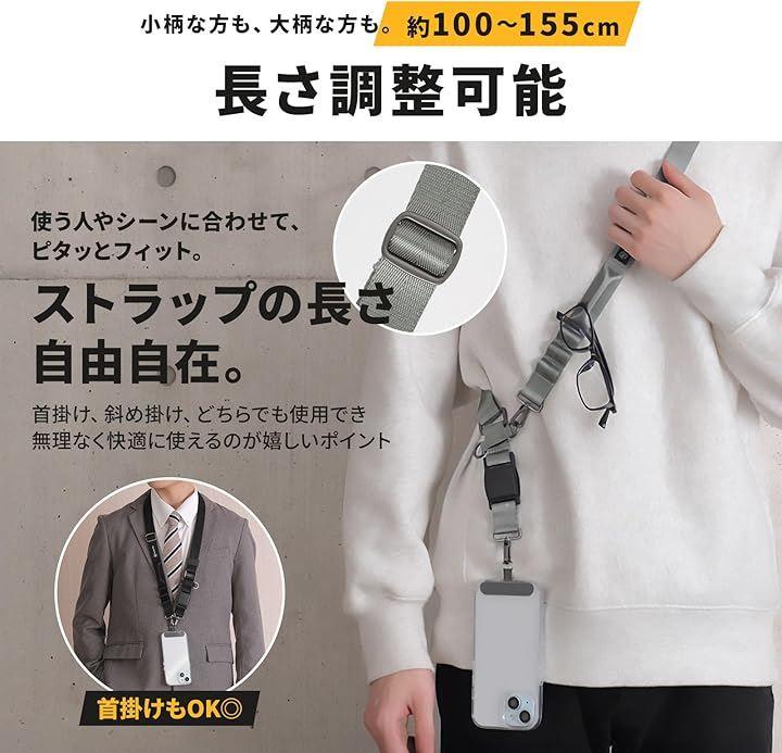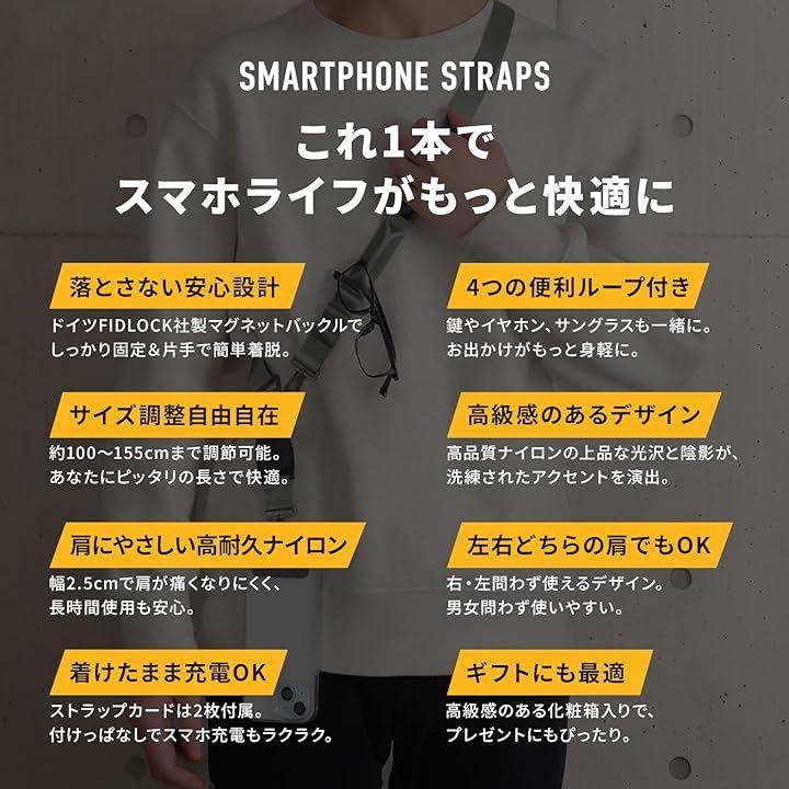 「製品仕様」 * 対応機種 : スマートフォン 各種 ( iPhone Android 他 ) * 内容物 : ストラップ x 1本、ストラップカード x 2個 * 長さ : 約 100cm ~ 155cm 幅 : 2.5cm * 重量 : 約 99g * 素材 : ナイロン、メタル、ポリカーボネート、マグネット