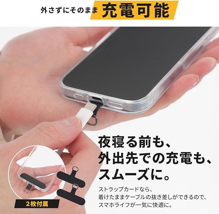 「ストラップカード付属(2枚)/長さ調節可能」スマホケースの充電穴にストラップカードを通すだけで簡単セット完了(*裏面がオープンタイプのケースには使用不可)。