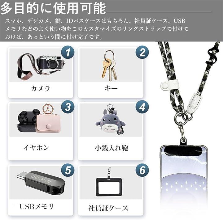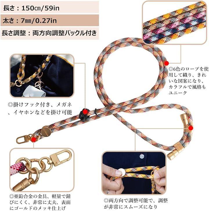 スマホストラップは自由に調節可能、調整の範囲:70-150cm、幅は人間工学に基づいたデザインで、太すぎず細すぎず、軽量で快適。