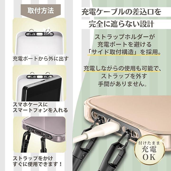 スマホの充電口を遮らないサイド取付構造を採用し、ストラップを外さずにそのまま充電が可能。