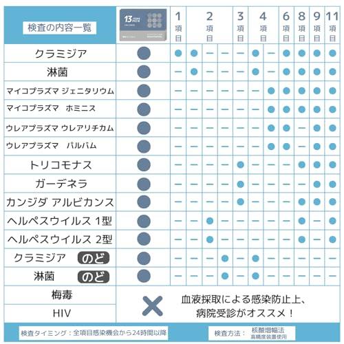 【検査項目|採取タイプ】クラミジア・淋病 淋菌・マイコプラズマ ジェニタリウム・マイコプラズマ ホミニス・ウレアプラズマ ウレアリチカム・ウレアプラズマ パルバム・トリコモナス・ガーデネラ・カンジダ アルビカンス・ヘルペスウイルス1型・ヘルペスウイルス2型 + のどクラミジア・のど淋菌|尿採取タイプ・のど採取タイプ 男性用 【理化学研究所発ベンチャー】国家資格の臨床検査技師によって感染症の微生物の遺伝子を検出します。性病の疑いをスピーディかつ精確な検査で特定およびその有無をお知らせいたします。 【核酸増幅法による高精度な検出】 原因微生物の特定遺伝子を連続的に増幅し、高感度に検出します。特殊な温度調節の精密機器を用いた検査方法により、トップクラスの検査精度を提供します。 【内容|補足】 採取容器・検査キットご利用方法・検査申込書・返送用封筒|匿名性の高いパッケージでお届け。申し込みも匿名でOKです。研究用試薬を用いた検査であり診断には使えませんのでご注意ください。 【提携クリニック】陽性の場合、 全国の提携 医療機関へのご紹介が可能です。オンライン診療希望の方はリモート受診できます。 【注意】ごくまれに検査ができない検体があります。この場合は、2025年2月17日より、検体の再提出をお願いする場合(無償)がございます。その際にはご協力をお願いいたします。 【注意】検査は、判定がでるまで実施し、結果をご報告しますので、ご安心ください。 ご不明点があれば、いつでもお問い合わせください。 (#lf)(#lf)(#lf)商品購入前に、ストア紹介ページをご確認ください。