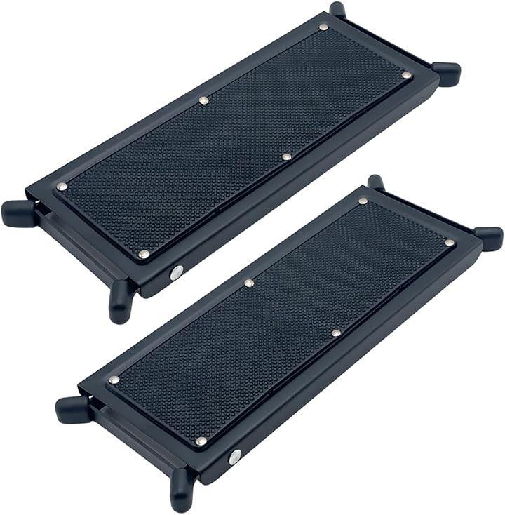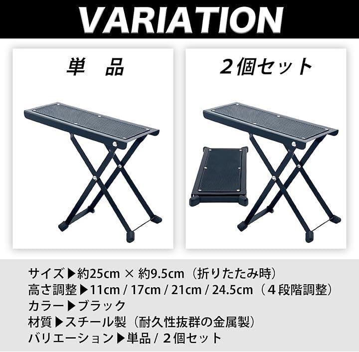 「仕様」サイズ:約25cm x 約9.5cm(折りたたみ時コンパクト) / 高さ調整:11cm / 17cm / 21cm / 24.5cm(4段階調整) / カラー:ブラック / 材質:スチール製(耐久性抜群の金属製) / バリエーション:2個セット、1個