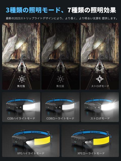 【7倍高輝度照明】7本テープライトで計210球の白い高輝度LEDヘッドライト。3種類の点灯モードで、さまざなな場合にも対応できます。(高輝度低輝度閃光)