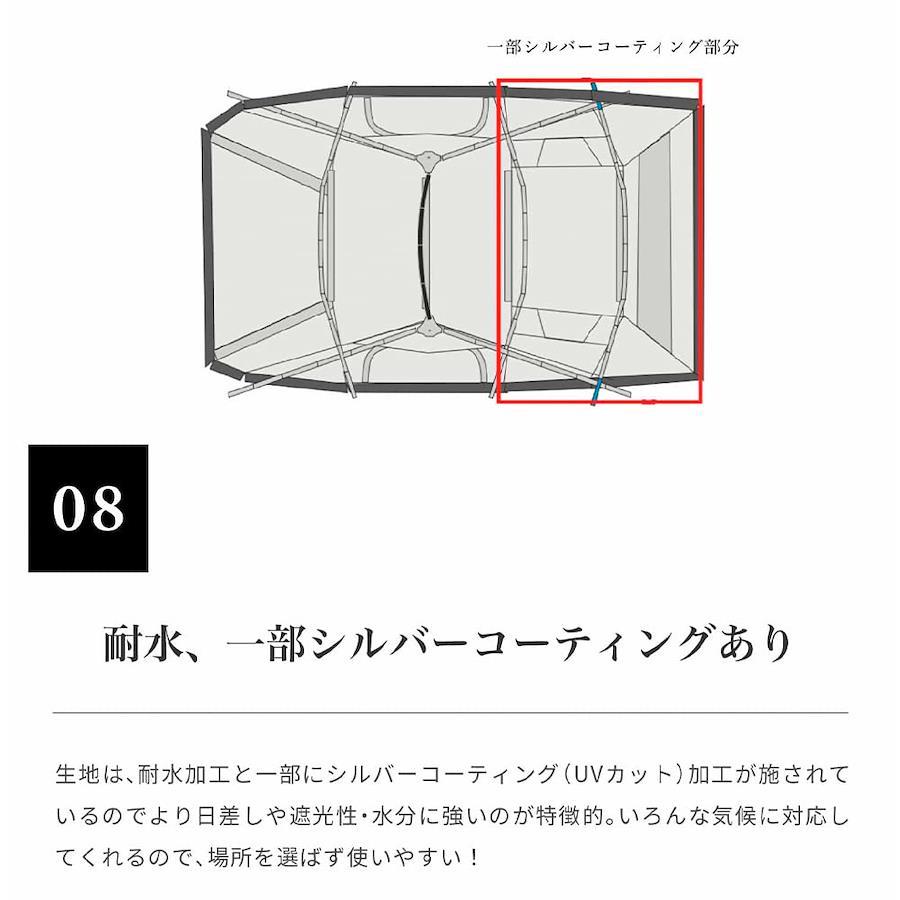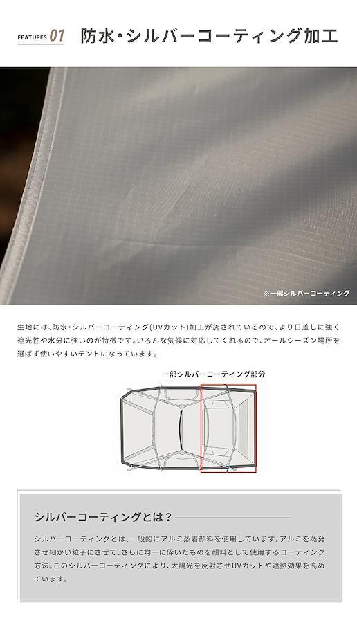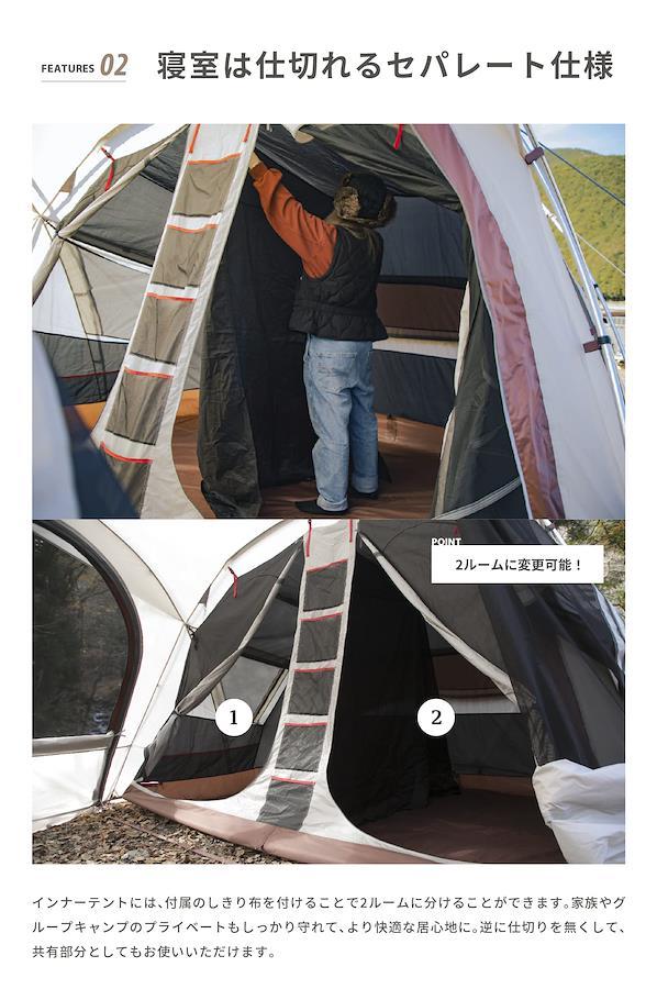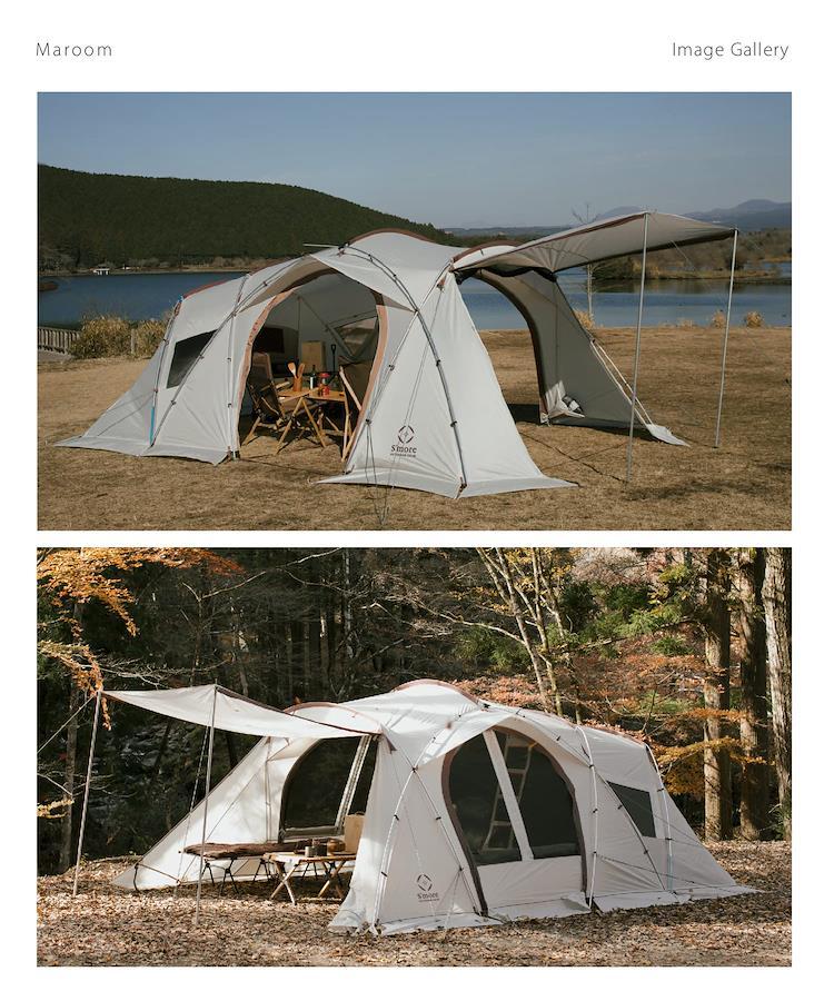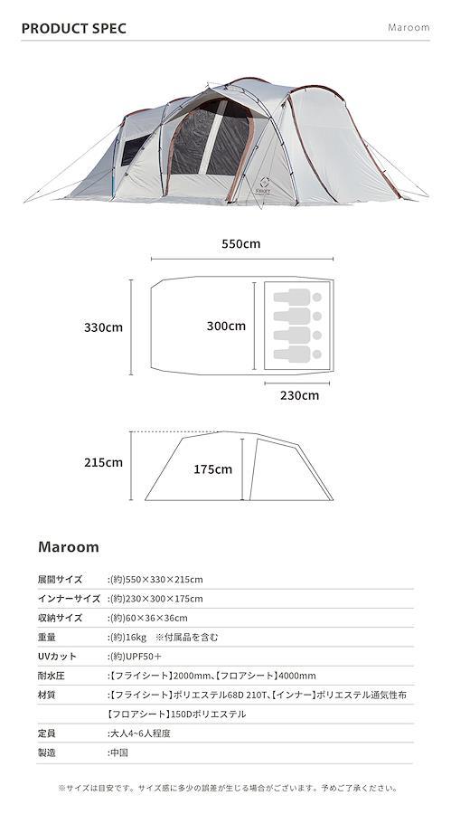 【しきり壁を付けられるセパレートタイプ】 前室が広く、インナーテントは取り外し可能で付属の仕切り布を付けられるセパレートタイプの4人用テント。グループやファミリーでの共有スペース使いや、用途に合わせていろいろな使い方ができる大型テントです。【広い前室、前面にキャノピー付き】 前室がとても広いのがMaroomの特徴。キャノピーも付いていてこれ一つあればキャンプサイトの完成!とても広く開放感があるので、ゆったりとお過ごしいただけます。【テントサイドには180度開放できるメッシュ付き窓】 通気性を良くして、結露を防いでくれるベンチレーション。外気とテント内部の温度調整や空気を効率的に循環させてくれます。【寝室は仕切り布を使うことで2ルームに!】 インナーテントには、付属のしきり布を付けることで2ルームに分けることができます。家族やグループキャンプのプライベートもしっかり守れて、より快適な居心地に。逆に仕切りを無くして、共有部分としても使えるので使い方はあなた次第!【設営簡単で吊り下げタイプのインナーテント】 インナーテントは吊り下げ仕様で簡単に設営できます。高さが170cm程度の方でも入れるほど高く、天井の圧迫感がないので大人4人でも広々とお過ごしいただけます。