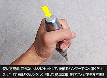 チカラを込めても回らなくなってしまった、錆びたネジやナメてしまったネジ…。このショックドライバーなら簡単に回せちゃいます!!使い方は簡単!! 回らないネジにセットして、後部をハンマーでぶっ叩くだけ!!ぶっ叩いたパワーでネジにしっかり食いつきながら、同時に叩いたパワーを回転力に変換!!スッキリするほどグルングルン回して、簡単に取り外すことができます!!正転・逆転どちらにも回せます!!セット内容ショックドライバー×1プラスビット×4マイナスビット×3ケースサイズ:約206mm×105mm商品重量:約980g