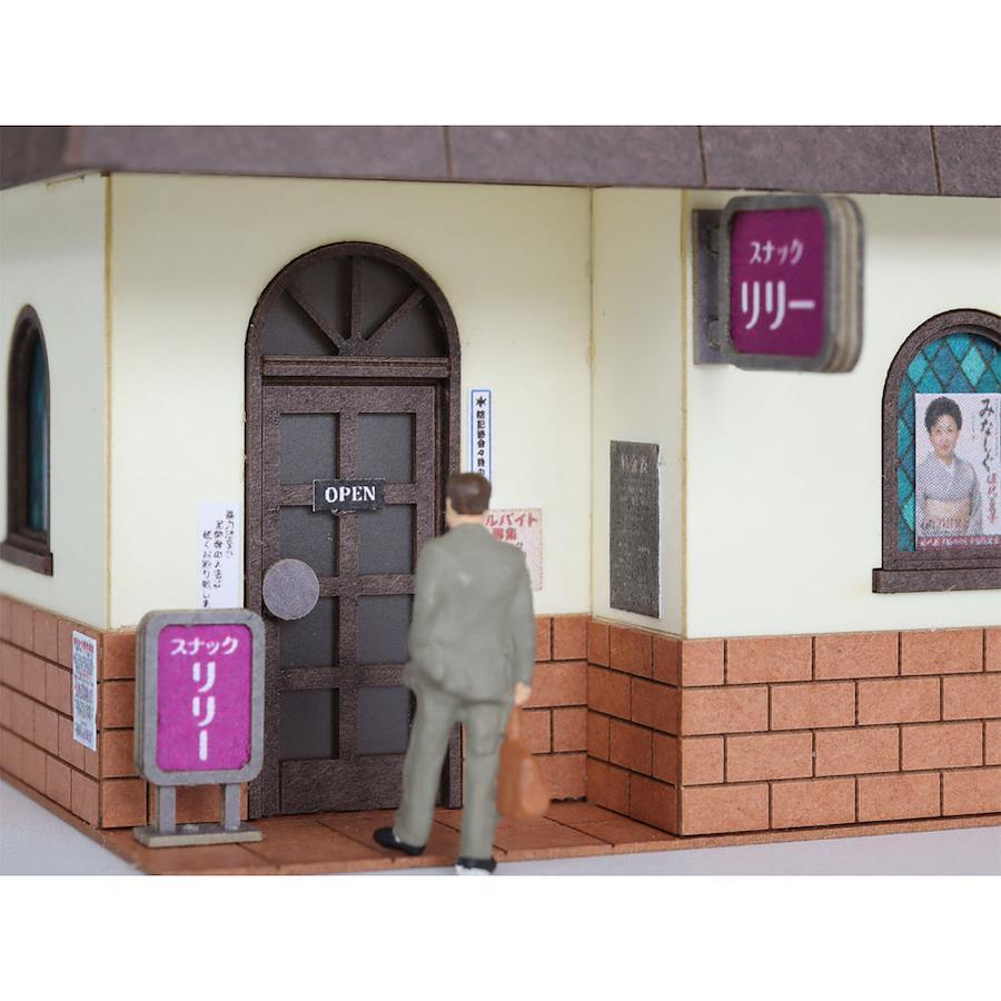 郊外の住宅街にあるスナックのイメージ。付属のダイヤ柄シートをガラスの裏から接着すると、よりスナック感が増します。または、付属の窓埋めパーツで、壁と同素材で窓を埋めることもできます(写真8枚目)ケーキ屋さんや喫茶店にアレンジしても面白いでしょう。