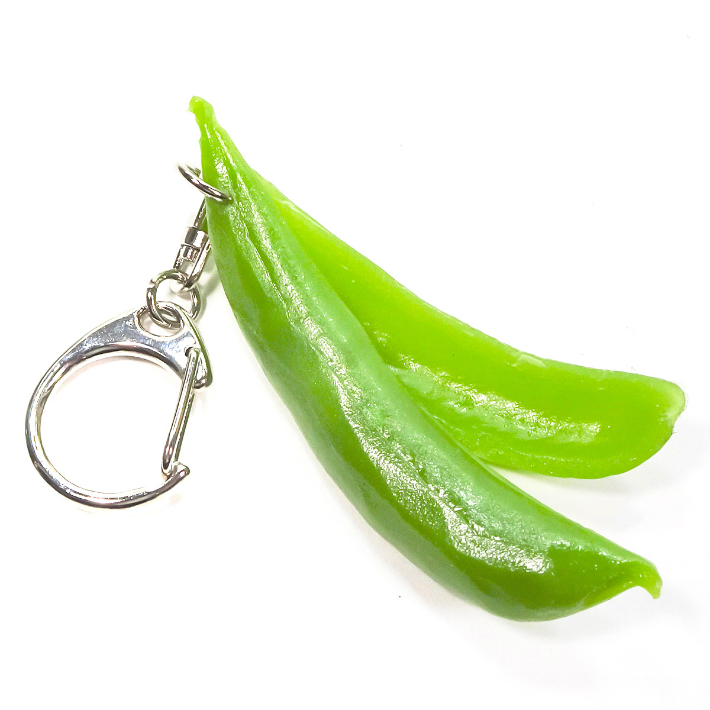 本物のスナップえんどうそっくりに作られた食品サンプルのストラップです。さやのなかには豆が詰まっています。