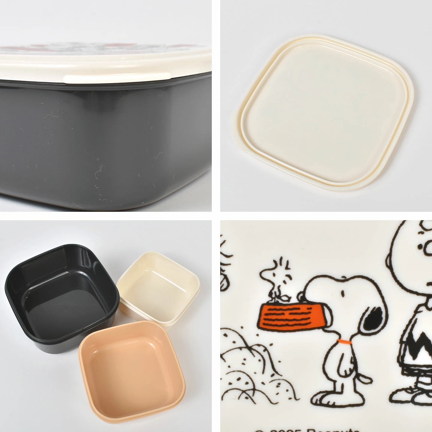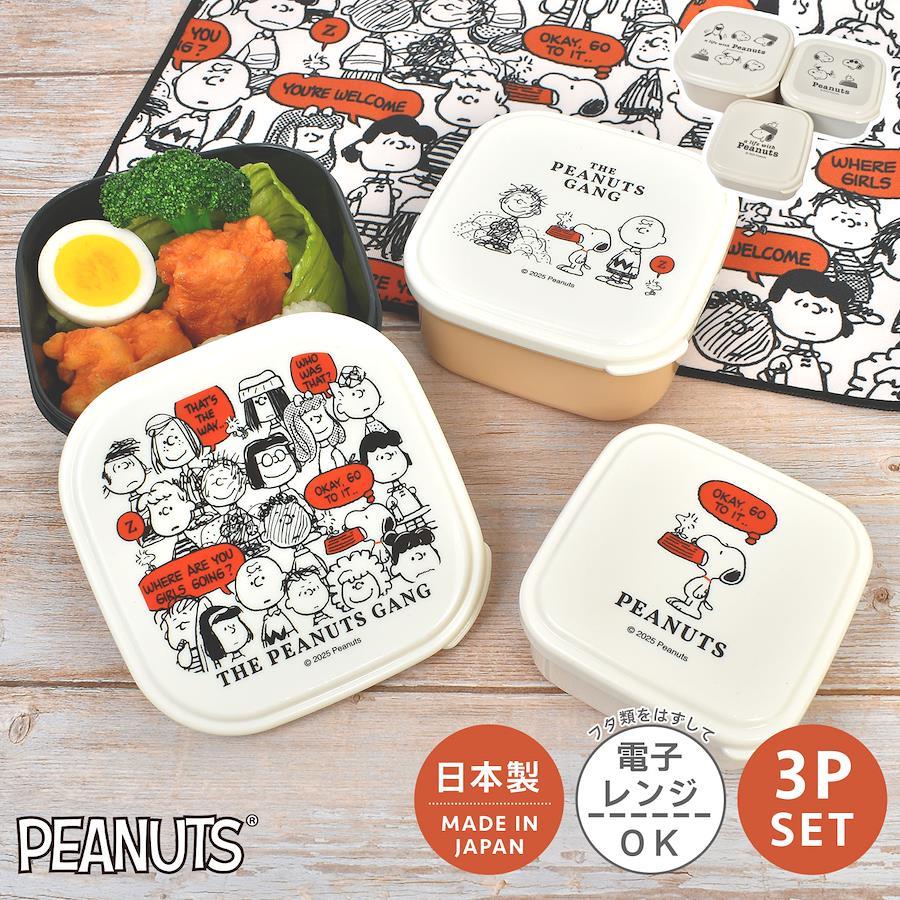 スヌーピーと仲間たちのイラストが可愛い、3個セットのシール容器。お弁当や作り置きなど様々な用途で使えます。フタを外せばレンジで温めができ、使わないときは入れ子式で重ねてコンパクトに収納可能!安心の日本製アイテムです。