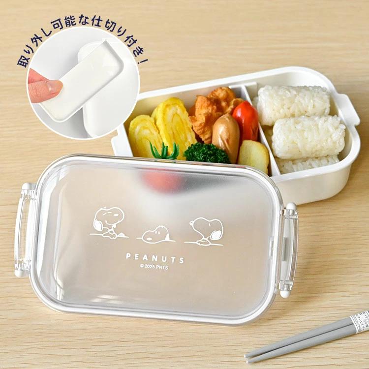 【長角タイトランチボックスM】スヌーピーのイラストが可愛いシンプルな1段タイプのお弁当箱。持ち運びも安心な2点ロック式で、盛り付けに便利な仕切り付き◎フタを外せばレンジで温めも可能、容量はお子様や女性にもちょうどいい小さめの480ml。安心の日本製アイテムです。同じ柄のランチアイテムと揃えても♪