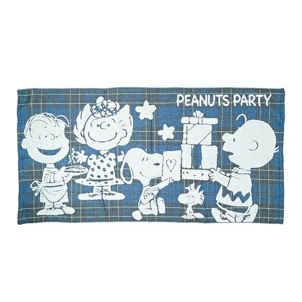 深みのあるブルーカラーのチェック柄がかわいいガーゼ地に、スヌーピーと仲間たちを無撚糸パイルで表現したバスタオルです。ふんわりやわらか素材◎