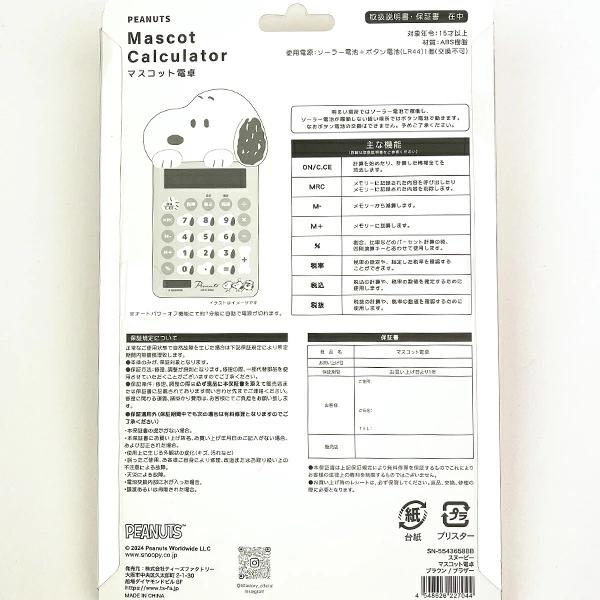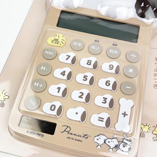 スヌーピーがひょっこりのぞくデザインとダイカットボタンがポイントの電卓です。画面が見やすい傾斜付きと実用的な滑り止めつきで便利♪明るい場所ではソーラー電池で稼働し、ソーラー電池が稼働しない暗い場所ではボタン電池でうごきます。*なおボタン電池の交換はできません。予めご了承ください。
