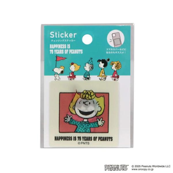 スヌーピーと仲間たちが集まって、みんなで75周年のお祝いしている姿を個性豊かに表現したデザインのチェンジングステッカーです。スマホケースやパソコンなどに貼れるステッカー♪少し傾けると3段階にチェンジする!周年のお祝いにいかがですか?特別なデザインなのでぜひ同シリーズでお好きなアイテムを揃えてみてください♪