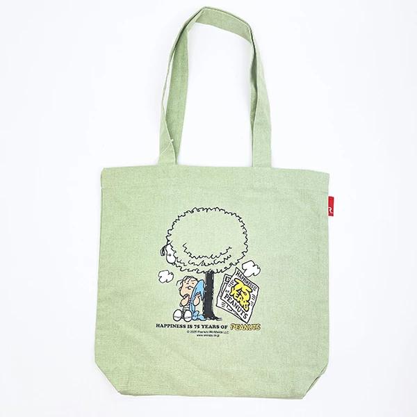 スヌーピーのトートバッグです♪75周年限定デザインのプリントがおしゃれ♪ナチュラルなくすみカラーもキュート♪A4サイズも余裕で入るサイズなので、通学や通勤にも大活躍♪リサイクルコットンなので、環境に優しいのも◎内側と背面にもポケットがついているので、仕分けもできて、サッと取り出したいものを入れておけますよ☆彡