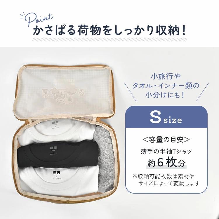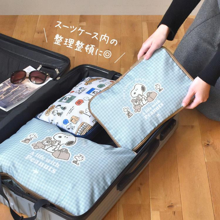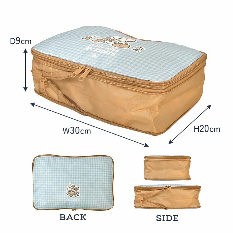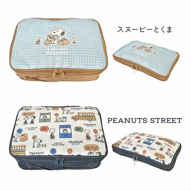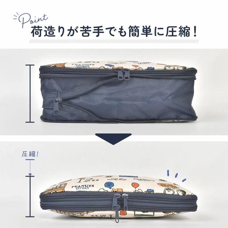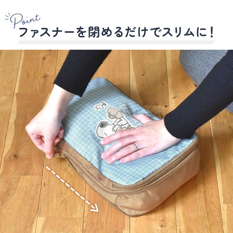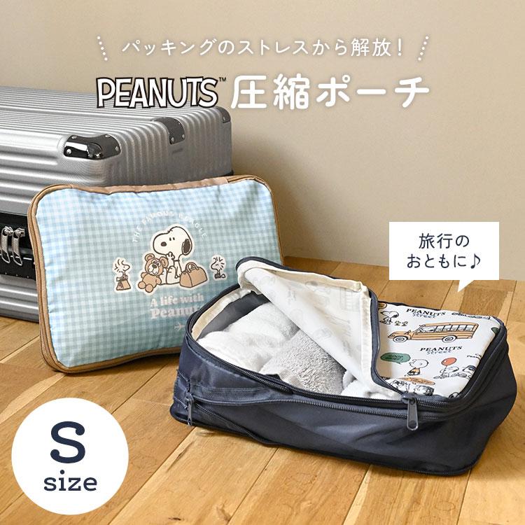 【圧縮ポーチS】ファスナーを閉めるだけでかさばる旅行の荷物をスッキリコンパクトに収納できるスヌーピーの圧縮トラベルポーチ。道具が必要ないので旅先でも手軽に使えて便利です♪キャリーバッグの整理やおみやげのスペース確保など、旅行時のパッキングのお悩みを解決!洋服はもちろんかさばるタオルやインナー類の収納にもぴったり!旅行はもちろんお家の洋服収納アイテムとしても使えます◎