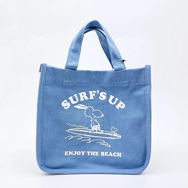 サーフィンを楽しんでいるスヌーピーのデザインが可愛いバッグです! 腕に引っ掛けて持つことが出来る長さの持ち手があります。マチがあるのでランチバッグとしても使っていただけます。様々な大きさのポケットがあるので、小物や500mlのペットボトルも入れられるのも便利! 落ち着いている色味でどなたにも使っていただけます♪ ちょっとコンビニへ・・のようなちょこっと外出にもよさそう◎ マグネットボタンもあるので安心です!