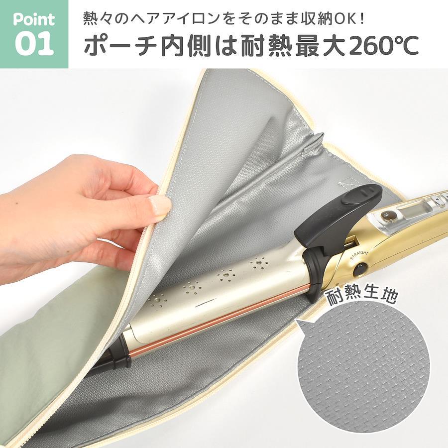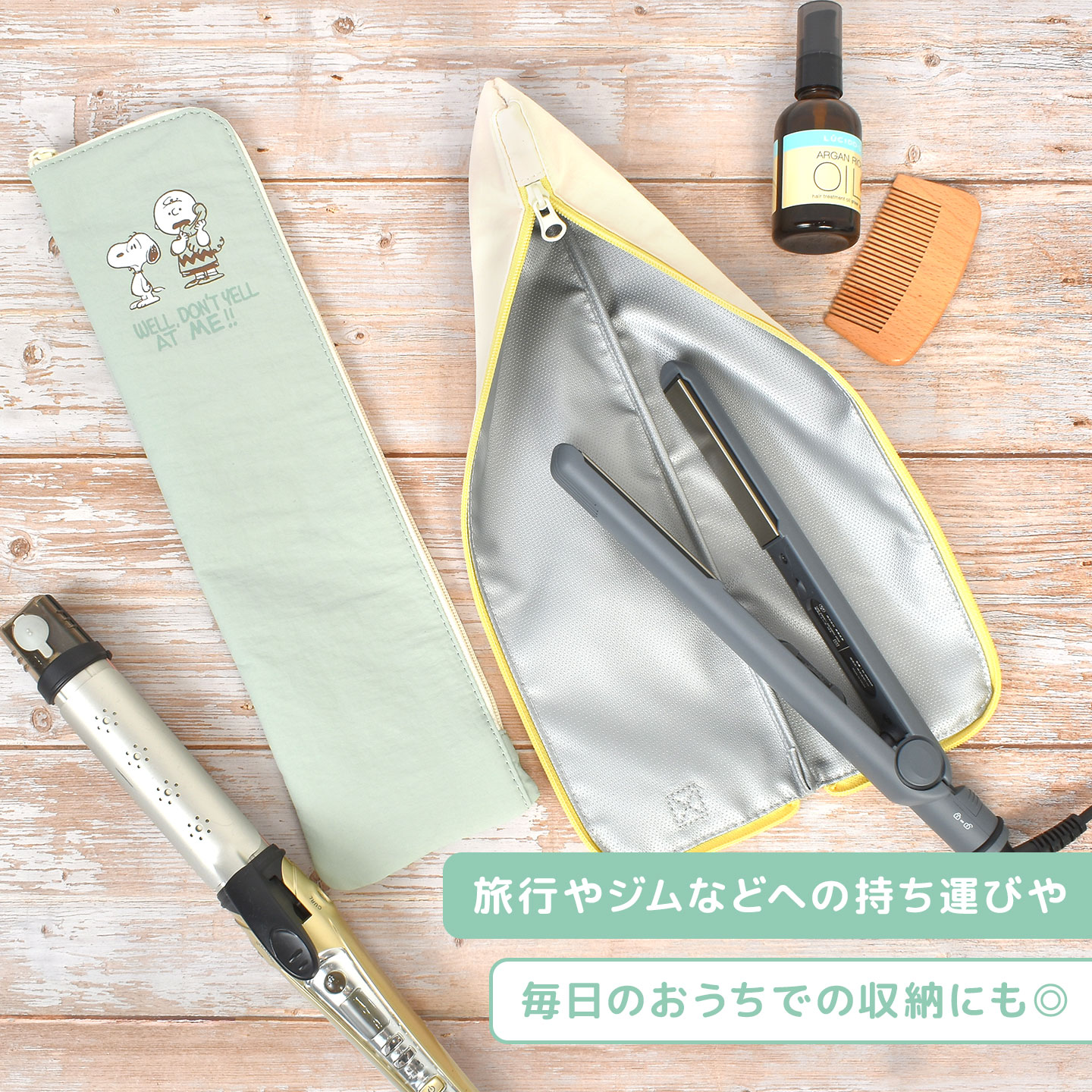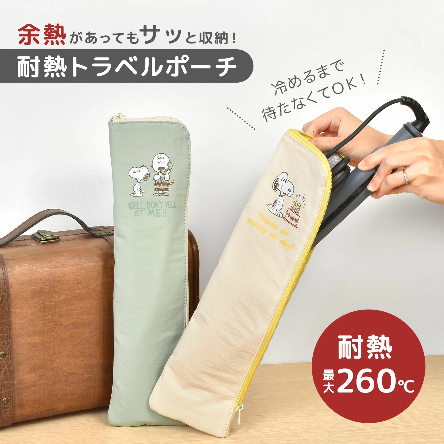 余熱があってもサッと収納できる、スヌーピーの耐熱トラベルポーチ。内側が耐熱素材になっており、熱々のヘアアイロンもそのまま収納できる便利なアイテム♪最大耐熱温度は260℃で使用後すぐに片付けられるので、忙しい朝や旅行先でも大活躍します◎背面ポケットには絡まりがちなコードを収納可能。ストラップで吊り下げて収納もできるので、スペースを取らずにサッと使えます◎シンプルで大人かわいいデザインでプレゼントにもおすすめです。