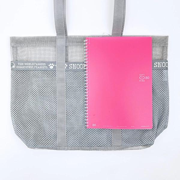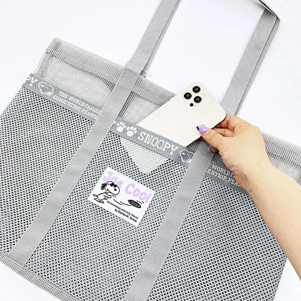 スヌーピーのワイドトートバッグです♪普段使いはもちろんアウトドアやビーチにも大活躍!ちょっとした小物を入れられる便利な外ポケット付き。マチもあるので荷物が多くなっても安心☆