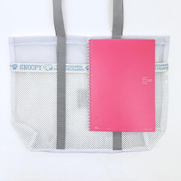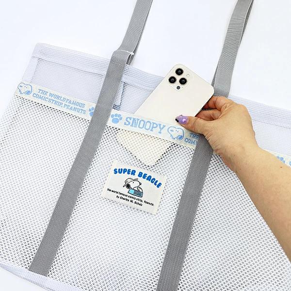 スヌーピーのワイドトートバッグです♪普段使いはもちろんアウトドアやビーチにも大活躍!ちょっとした小物を入れられる便利な外ポケット付き。マチもあるので荷物が多くなっても安心☆