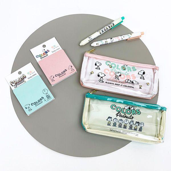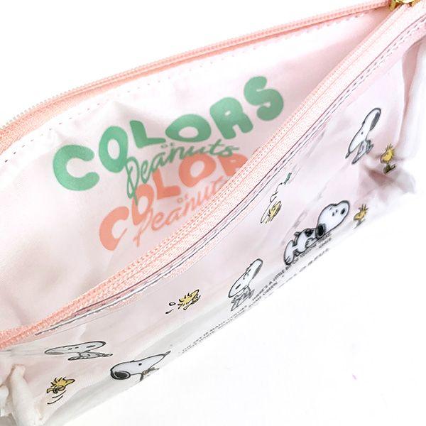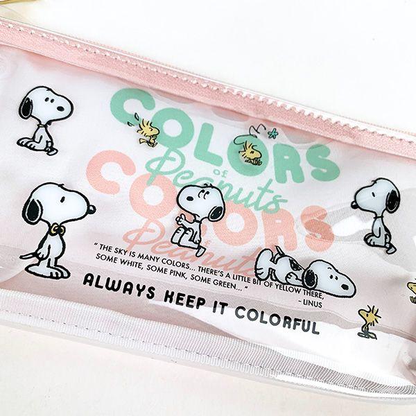 PEANUTSのなかまたちに、色とりどりの、チャーミングな個性を吹き込みました。正面の透明生地にはスヌーピーとウッドストック、内生地には「COLORSofPeanuts」のロゴがプリントされた、中身が透けて見える片面クリアタイプのペンケースです。