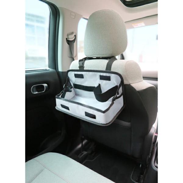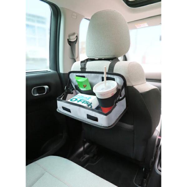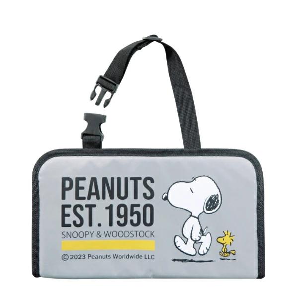 ヘッドレストポールに取り付けて使用するスヌーピーデザインのリアトレーです。バックル付きベルトで簡単に装着できます。右側のゴムベルトにはペットボトル等のドリンクを差し込んで固定できます。左側のゴムベルトにはスマホやお菓子、ウェットティッシュ等を挟んで便利に使えます。トレー部分は安心感のあるフチ付きです。使用しない時は折りたたんでコンパクトに収納出来ます。