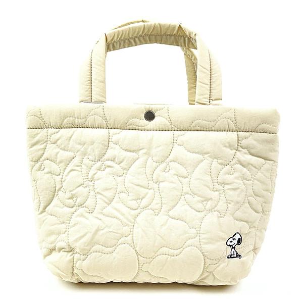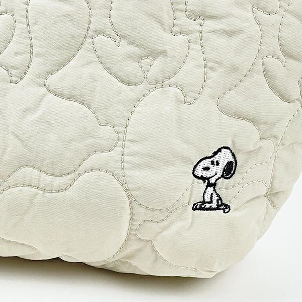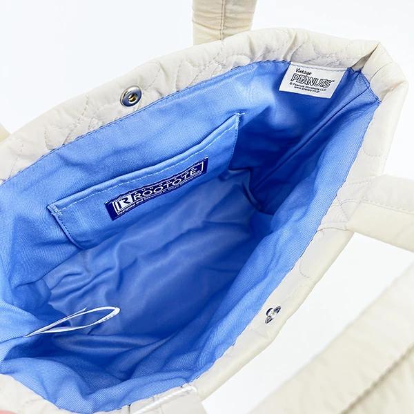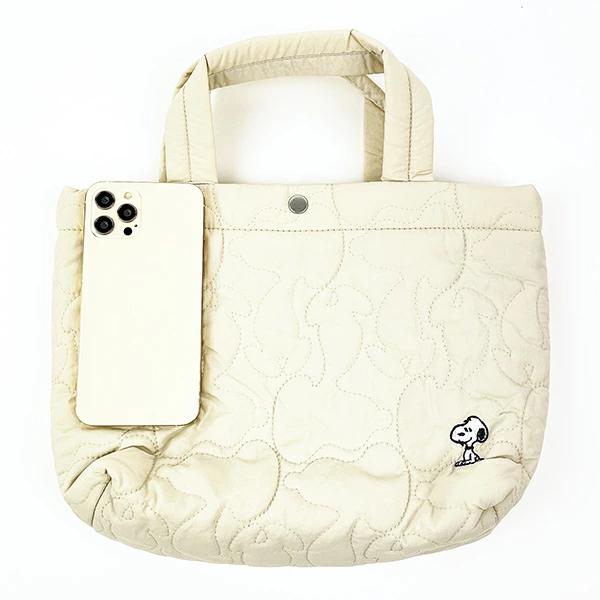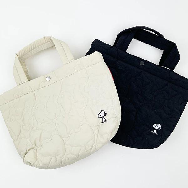スヌーピーのキルティングトートバッグです。ランチ用にも使える大きさ!外と内に1つずつポケットが付いているので使い勝手も◎キルティングもスヌーピーの形になっているのも可愛いポイント♪オールシーズンお使いいただけます☆