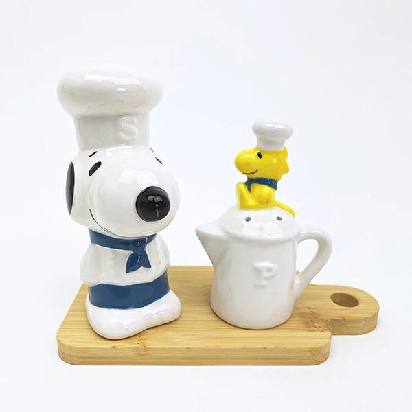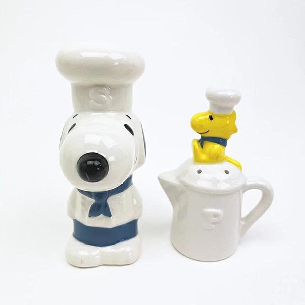 スヌーピーとウッドストックのソルト&ペッパーセットです。 オシャレな台座付き♪ テーブルに置いてあるだけで可愛い♪ シェフの恰好をしたスヌーピーとウッドストックが食卓の料理を美味しく仕上げしてくれているかの様です☆彡【台座:8.5×6.5×1cm スヌーピー:12×5×7cm ウッドストック:10×4×6cm】