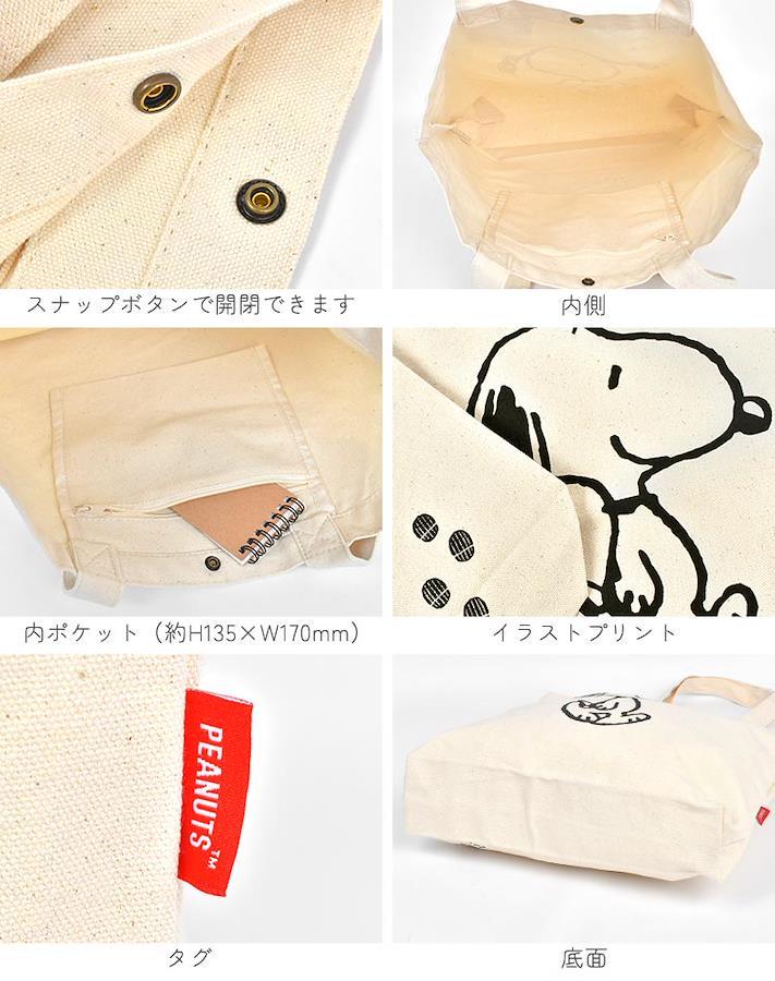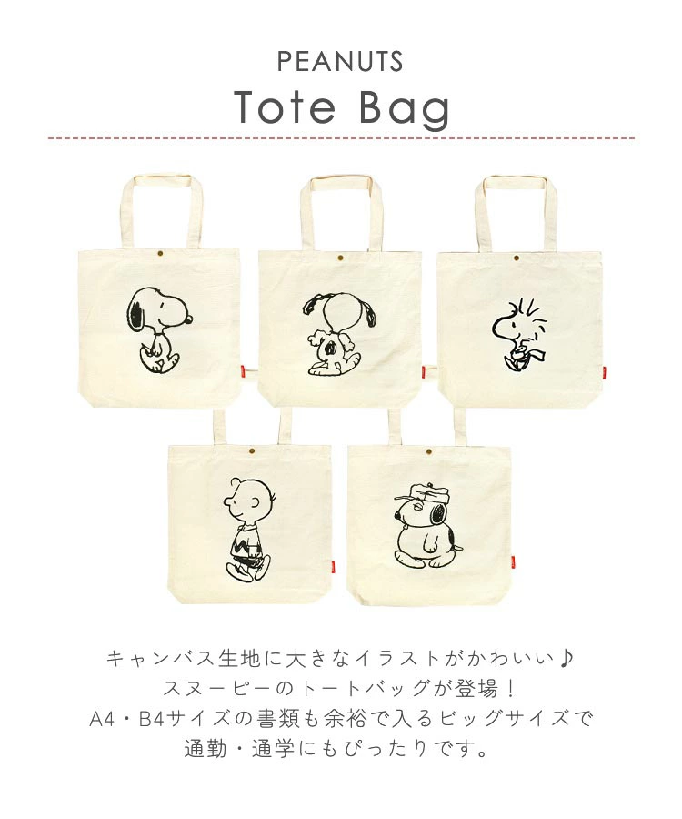 【トートバッグ】キャンバス生地に大きなイラストがかわいいスヌーピーのトートバッグ。マチ付きでA4・B4サイズの書類もラクラク入る大容量!小物の収納に便利な内ポケットも付いています◎誰でも使いやすいシンプルなデザインで、通勤通学など普段使いにぴったりです♪