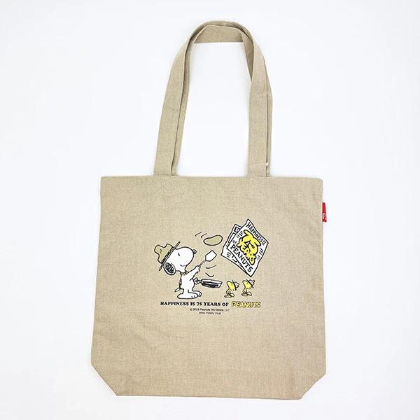 スヌーピーのトートバッグです♪75周年限定デザインのプリントがおしゃれ♪ナチュラルなくすみカラーもキュート♪A4サイズも余裕で入るサイズなので、通学や通勤にも大活躍♪リサイクルコットンなので、環境に優しいのも◎内側と背面にもポケットがついているので、仕分けもできて、サッと取り出したいものを入れておけますよ☆彡