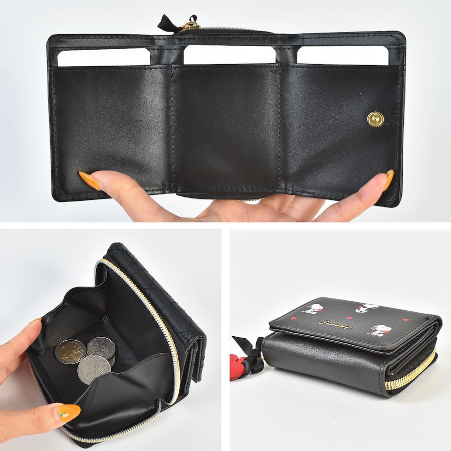 【三つ折り財布】シックなブラックにスヌーピーのデザインが、大人かわいい三つ折り財布。お札入れ1つとカードポケット3つのシンプル&コンパクトな仕様。がま口のコインケース部分は大きく開き、中身が見やすい形です。年齢問わず使えるデザインで、ギフトやプレゼントにもオススメのアイテム♪通勤・通学などの普段使いはもちろん、小さめなのでちょっとしたお出かけ用のサブ財布にも◎
