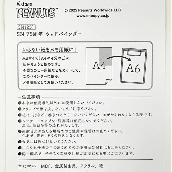 スヌーピーの75周年デザインが可愛い、ウッドバインダーです♪75周年にぴったりな全員集合デザインがキュート♪木のぬくもりあるナチュラル素材で、アクリルチャーム付き♪いらない紙をメモ用紙に使えるミニサイズ♪ぜひ周年のお祝いにお手に取ってみてください☆彡