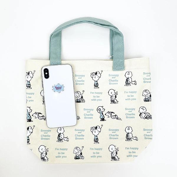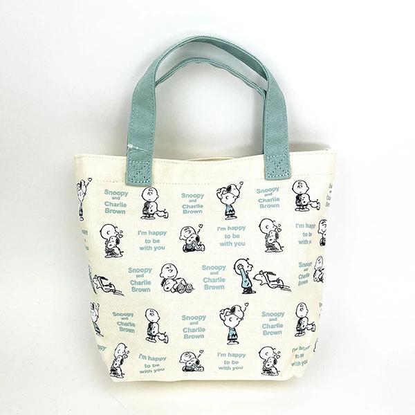 チャーリーブラウンに甘えてハグするスヌーピーの絵柄がかわいいハグシリーズ。バッグの口はファスナー開閉タイプで中身が見えず安心。