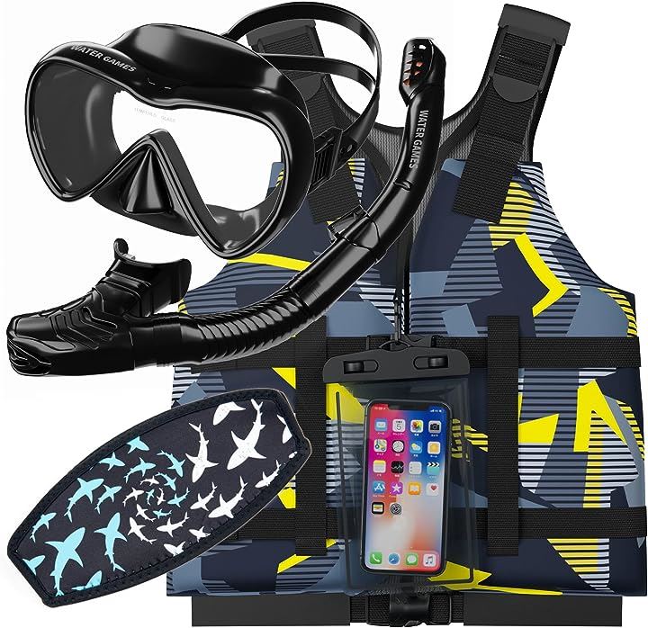 ・「スリムで動きやすいマリンベスト+シュノーケルセット」動きやすいスリムでスマートなフローティングベストとマスク、シュノーケルの嬉しい組み合わせセットです。