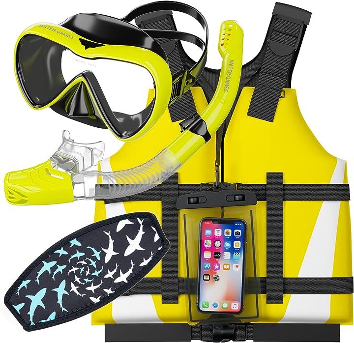 Snorkel, mask, and life vest 3-piece set with waterproof smartphone case and mask strap cover.