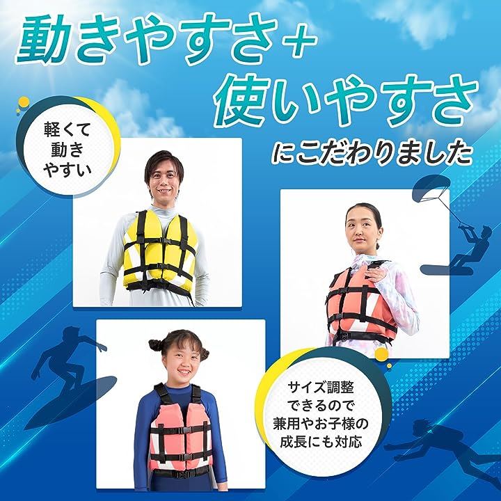 ・「JUST FIT」ベストは体にジャストフィットするので見た目がお洒落な上、浮力が発揮され着用していれば遊泳をサポートしてくれるのでより安全にマリンスポーツを楽しむことができます。