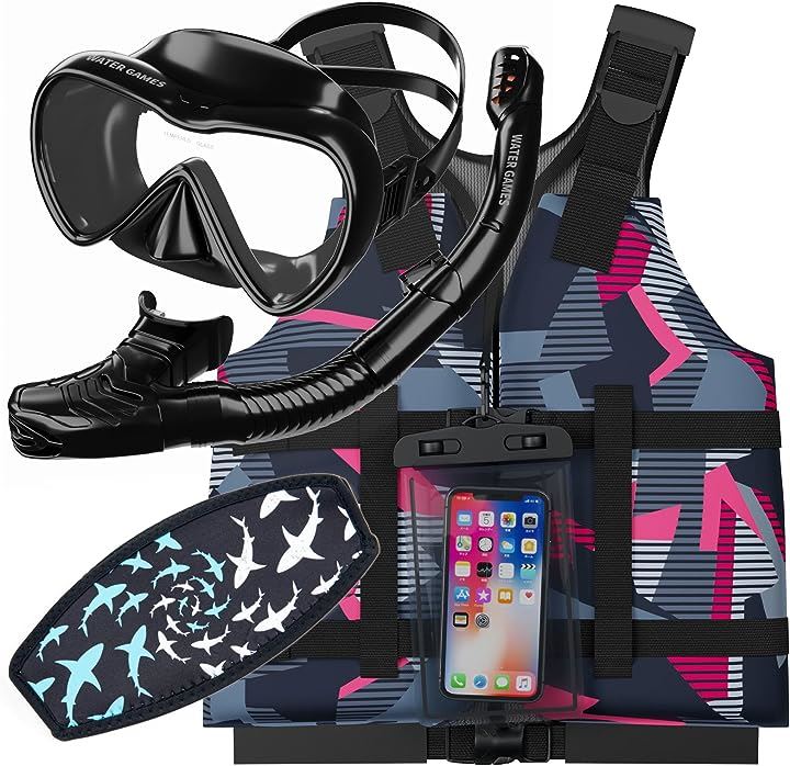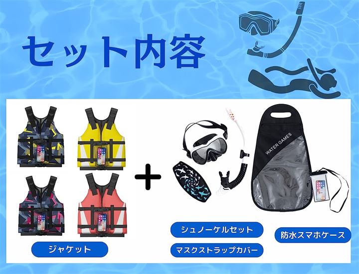 ・「スリムで動きやすいマリンベスト+シュノーケルセット」動きやすいスリムでスマートなフローティングベストとマスク、シュノーケルの嬉しい組み合わせセットです。