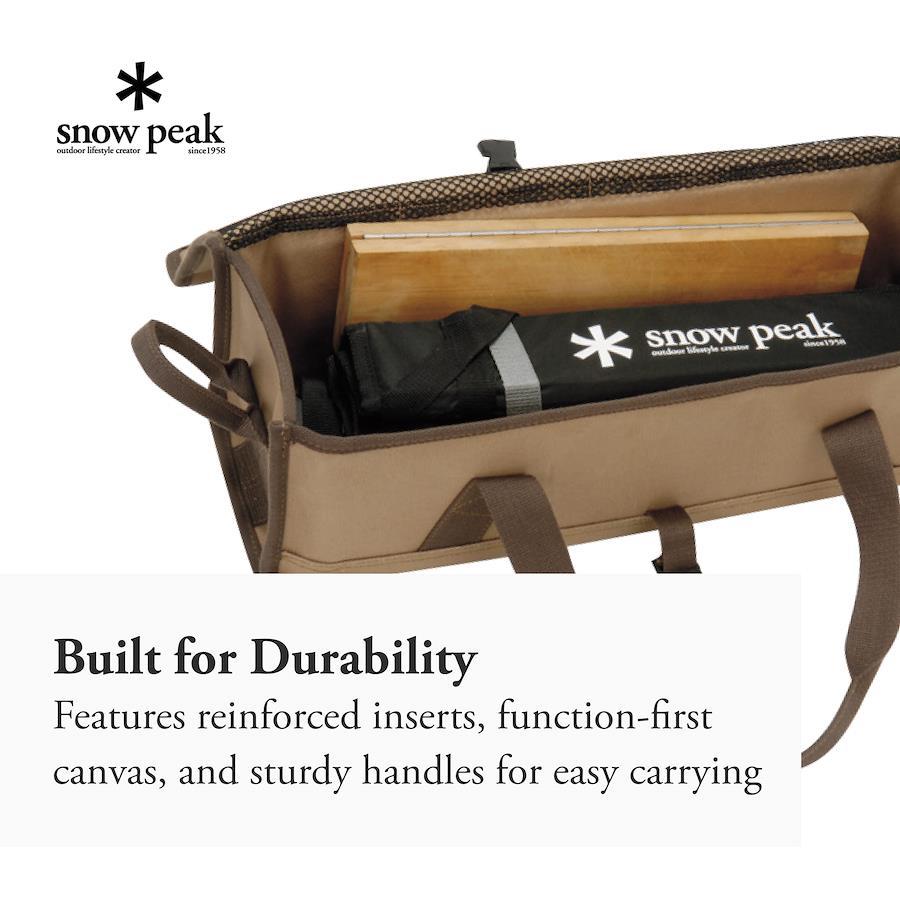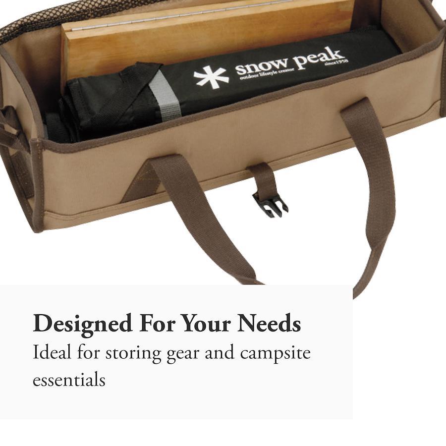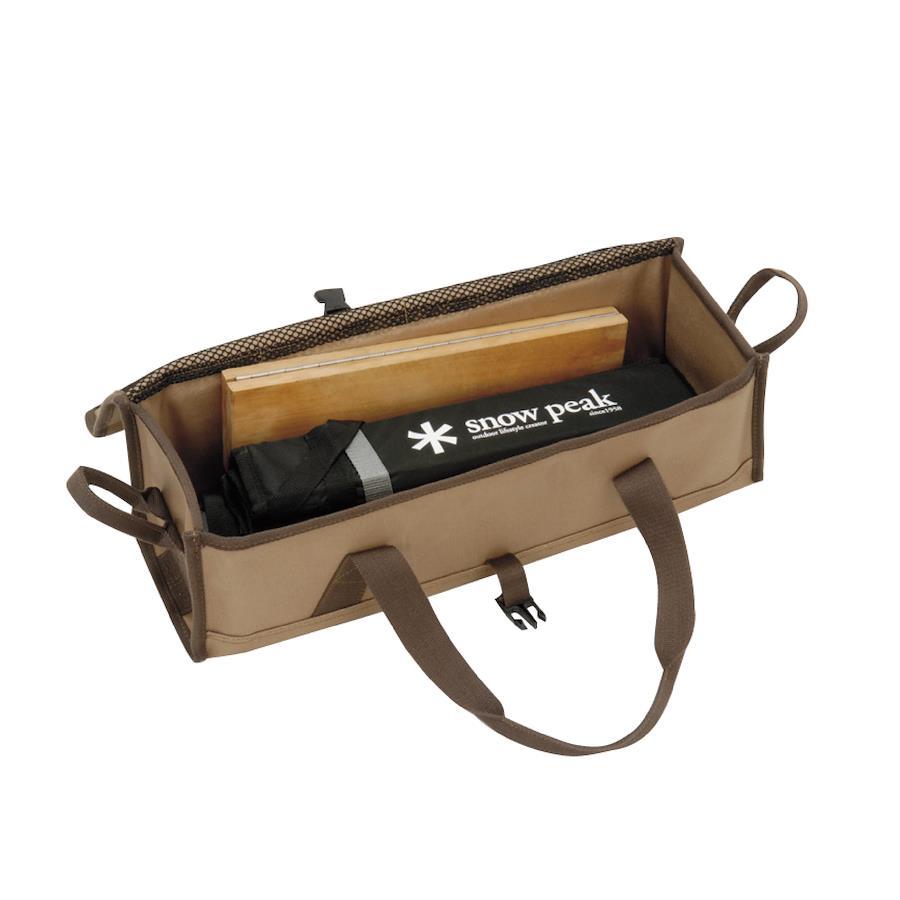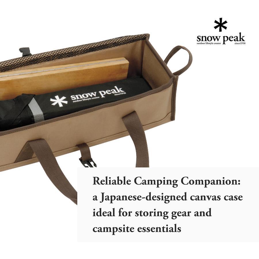 クライマーである故山井幸雄氏が自らの手と脚で高き頂きを目指す過程で、より使い勝手が良く、より信頼性の高い道具が欲しいというごく自然な欲求が生まれ、クライミングギアの開発を始める。徹底してユーザーの立場に立った製品開発を行うこと、そしてフィールドで実証することにより品質を磨くことがスノーピークのモノづくりの根本である。底には取りはずし可能な高耐久性のベルポーレンがセットされたマルチコンテナ。生地に頑丈な6号帆布を採用。風合いが出るパラフィン/PU加工を施している。ハンドルにはアクリルテープを使用し、感触の良さを向上させて、心地よい握り具合を実現。材質:6号帆布(パラフィン・PU加工)、アクリルテープ(中芯:PP)、樹脂板、ナイロンメッシュ、プラスチックサイズ:W540×H160×D180mm 重量:約1,100g