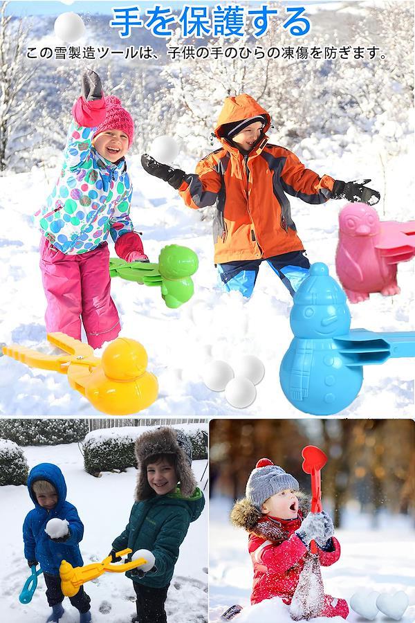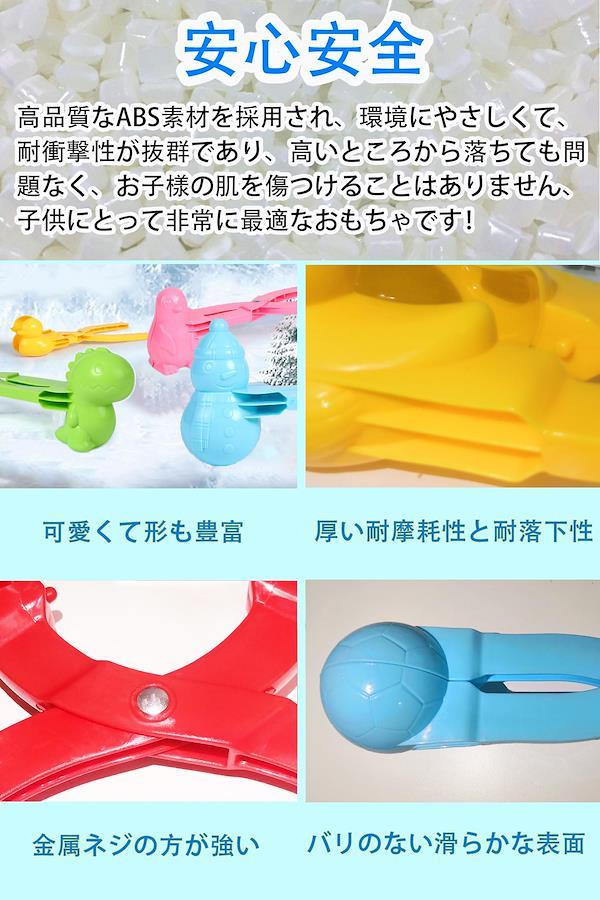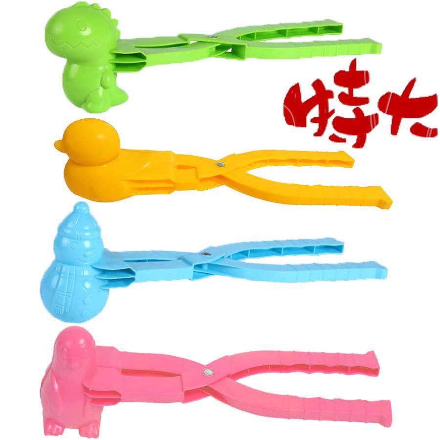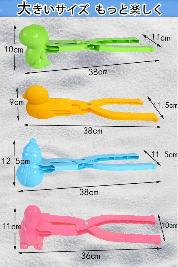 【特大スノーボールメーカー】特大スノーボールクリップが4個入っています。サイズ&カラー:恐竜(38x11x10cm、グリーン)、アヒル(38x11.5x9cm、イエロー)、雪だるま(38 x11.5x12.5cm、ブルー)、ペンギン(36x10x11cm、ピンク)。雪や砂をすくって握るだけで簡単に4種類のかわいい形の雪玉を作ることができます。 【高品質の素材】高品質なABS素材を採用され、環境にやさしくて、耐衝撃性が抜群であり、高いところから落ちても問題なく、お子様の肌を傷つけることはありません、子供にとって非常に最適なおもちゃです!取っ手はとても持ちやすく、砂玉や雪玉を作って手を清潔で暖かく保つことができます。★さらに、当社のスノークリップは金属製のネジで固定されており、他社のプラスチック製の釘よりも強く耐久性があります。 【能力の向上】スノーボールメーカーは、子供の好奇心と期待に応えるだけでなく、筋肉の発達に役立ちながら、季節の変化に適応する能力を向上させることができます。これは子供たちが子供時代を過ごすのに最適なおもちゃです。この雪製造ツールは、子供の手のひらの凍傷を防ぎます。 【雪合戦おもちゃ】たっぷりと雪をすくって、ハンドルを数回締め固めるだけで、簡単にゆきだまができちゃいます。数秒でかわいいスノーボールを作ろう。急いで、楽しい屋外スノーボールゲームを楽しんでください。 【すべての人に適しています】持ち手付きのスノーボールメーカーは、あらゆる年齢の方に適しています。砂遊びでも同様に使用可能ですので、ウィンターシーズンだけではなく、ビーチや砂場でも大活躍!